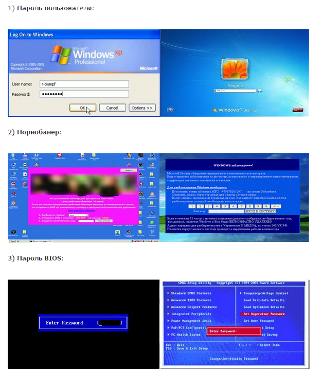 1) Многие люди, не желая делиться своим ноутбуком или компьютером, ставят пароль Windows. По каким-то причинам пароли теряются, удаляются вирусами, забываются и т.п. Первая мысль человека: "снести винду", но в учётной записи хранятся файлы и личные данные пользователя. Что делать в таком случае? Не беспокойтесь, наши специалисты снимут такой пароль за 5-10 минут.